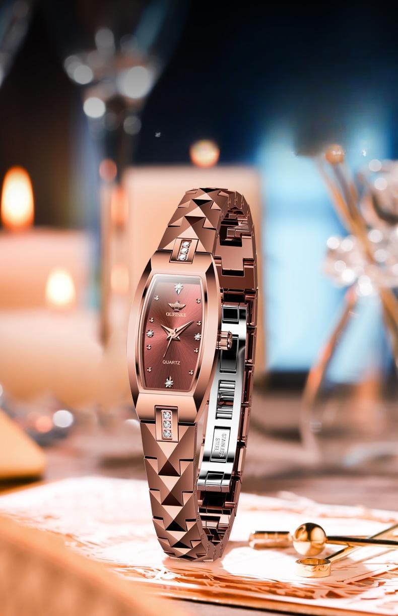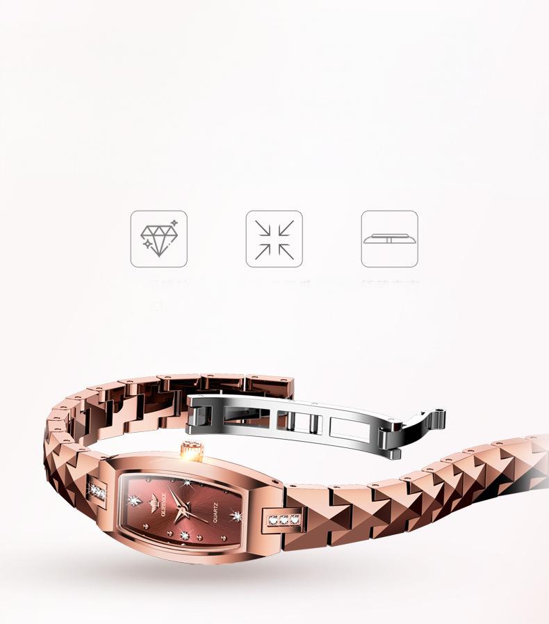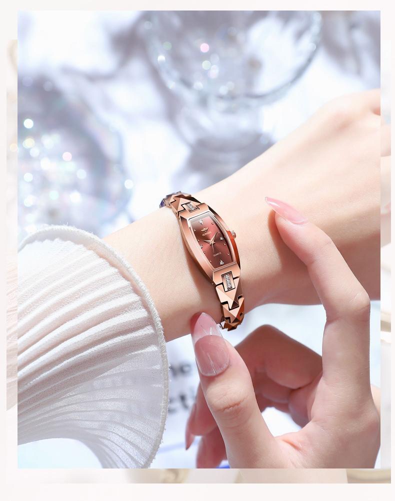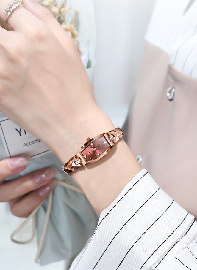 This 18K rose gold-plated women's watch combines minimalist luxury with elegance, designed for modern women who appreciate fashion. Its sophisticated design makes it perfect for everyday wear while also serving as a statement accessory for special occasions. The bracelet-style strap enhances comfort and turns the watch into a delicate piece of jewelry, adding an extra touch of elegance.