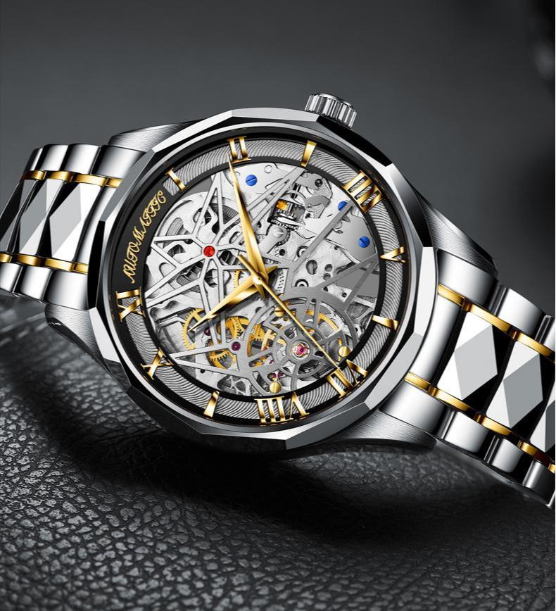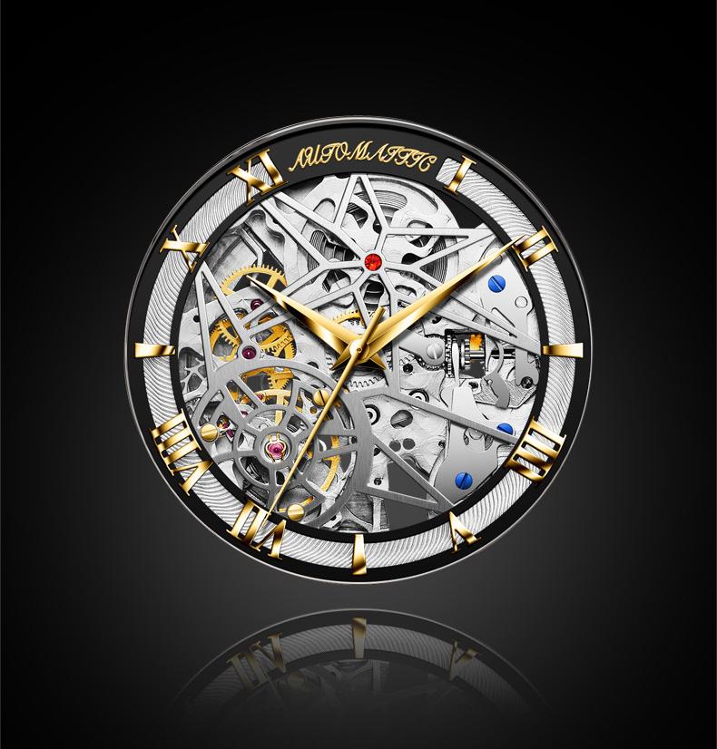 This watch perfectly combines modern technology with traditional craftsmanship, showcasing a sleek yet intricate design. The 41mm dial features a double-sided skeleton design, revealing the precise workings of the upgraded automatic movement. The scratch-resistant mineral glass ensures lasting clarity, while the reinforced sapphire dial provides extra durability. With a 12.6mm thickness and a 20mm wide tungsten steel strap, the watch is secured by a butterfly clasp, adding both convenience and elegance. Weighing 152.5g, it feels solid and comfortable to wear.
